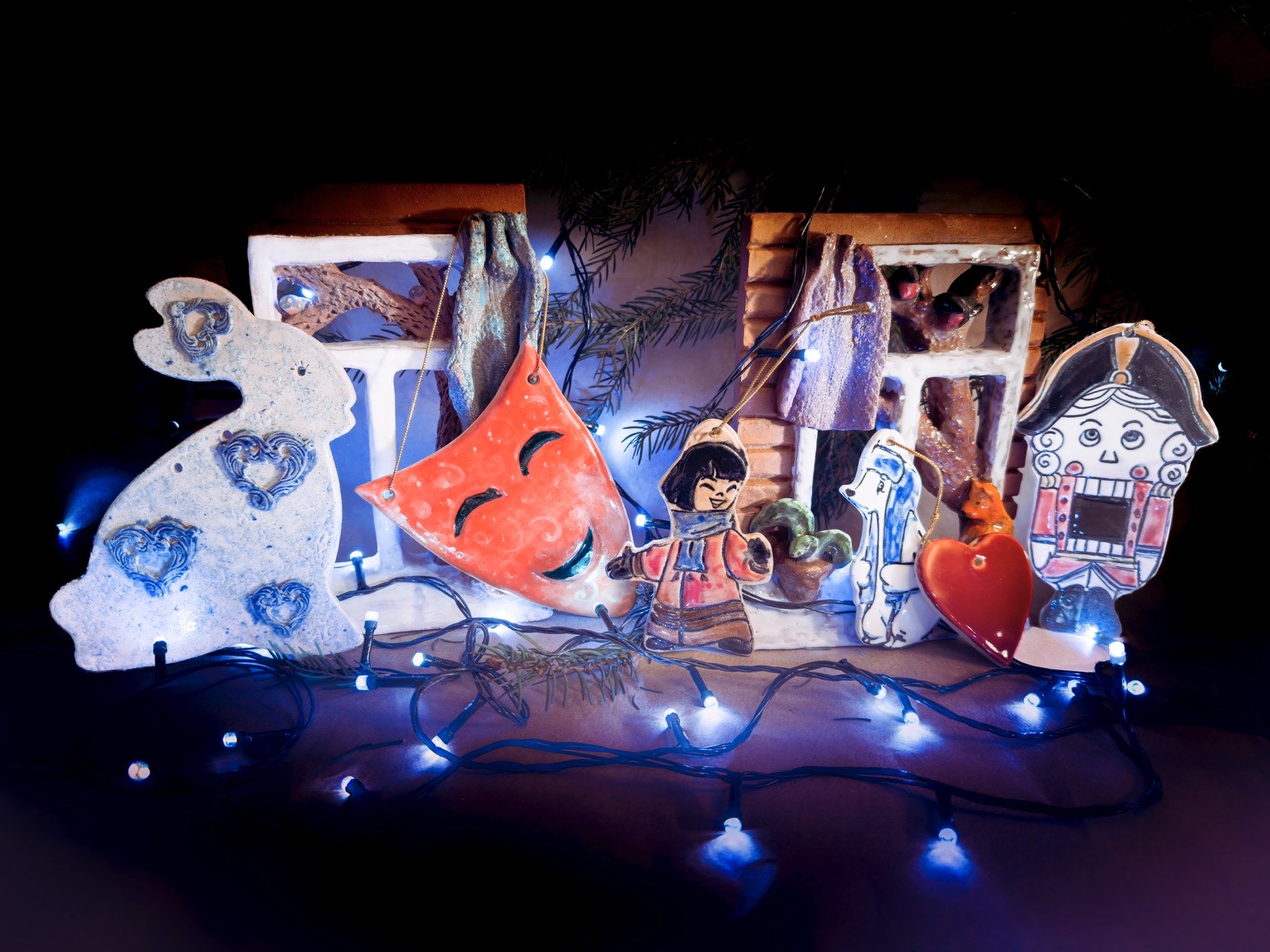 Экспозиция подготовлена художниками керамической мастерской «У фонтана» под руководством Анны Ведара специально для праздничного убранства атриума театра к Новому году.