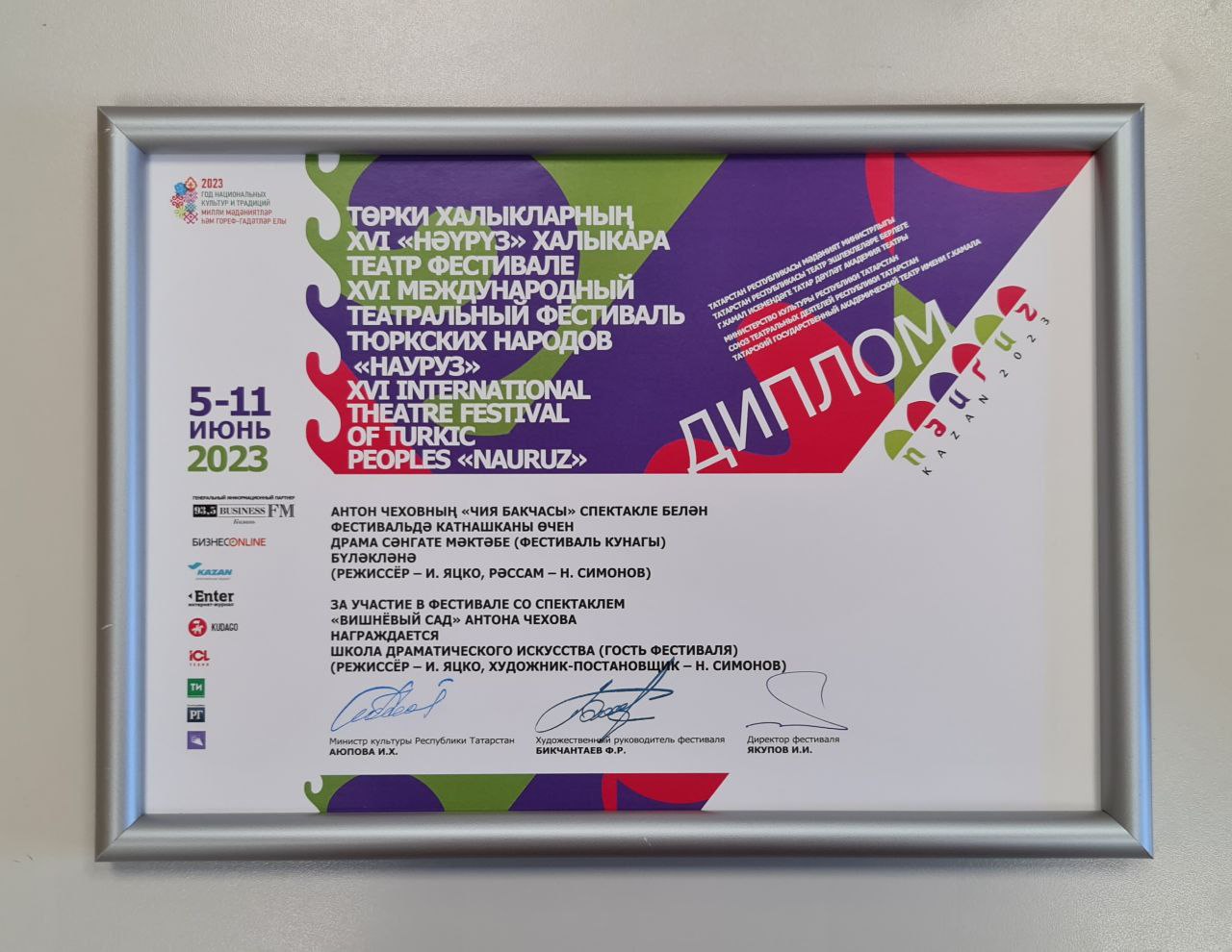 5 июня спектакль театра «Школа драматического искусства» «Вишневый сад» в постановке Игоря Яцко открыл XVI Международный театральный фестиваль «Науруз» в Казани.
