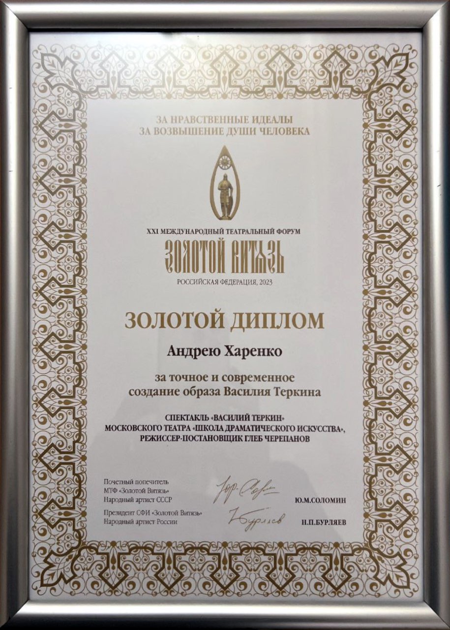 Золотой диплом Форума «За точное и современное создание образа Василия Теркина в спектакле «Василий Теркин», по одноименной поэме А. Твардовского в постановке Глеба Черепанова получил актер Андрей Харенко.